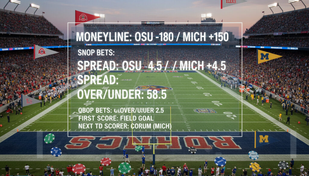 Plattformer for college football betting tilbyr vanligvis odds på kampvinnere, antall poeng, spillerprestasjoner og live-spill (in-play). Oddsene settes på bakgrunn av lagstatistikk, form og markedsetterspørsel. Det er mulig å finne 15–50 markeder per kamp på store, internasjonale sider.